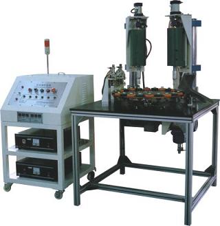 特点 1以IC控制回路设计,自动频率追踪,过载保护装置,品质稳定。 2焊接时间采用数字显示,可调整至l/100秒之精确度,调整简便,故障率低。 3同心直轴设计,后仰度最小,水平乖直精确机械结构强 4出力超强,熔接面特大。熔按效果可达到坚固美观速度快效率佳 两组超音波熔接机,自动熔接,转盘式送料增加生产力 底座可根据不同产品更换不同的底座不用锁螺丝,无需要调教 可另外增加传感器,无产品时不会触发超音波熔接,使机器效率更高,超音波系统寿命